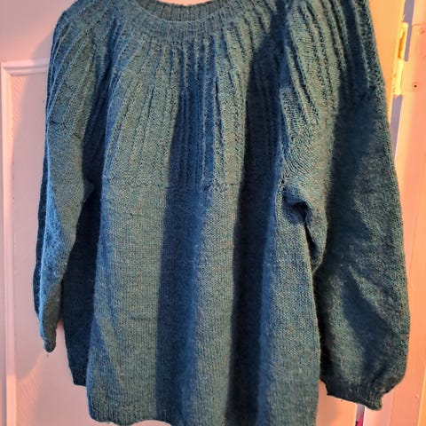 Strikket jakke i mohairgarn, str L. Strikket i 4 forskjellige grønnfarger og beige/offwhite. Overv - 112 cm, arm - 42 cm, hel l - 62 cm. Brukt 1 gang men ble for stor for meg.