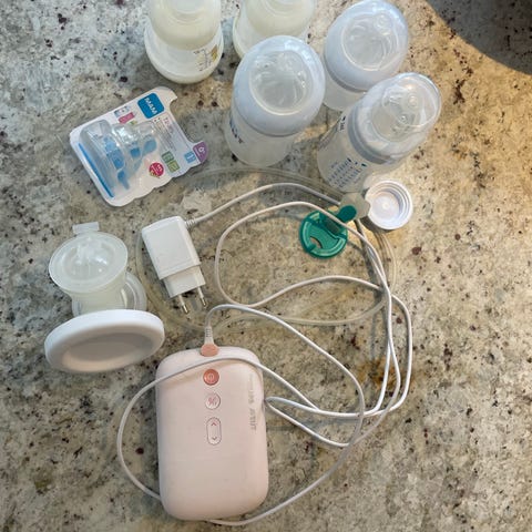 Avent tåteflasker og manuell brystpumpe, medela melkeposer og en twistshake flaksetørker. Bare vasket for hånd og sterilisert for hver gang. Brukt til ett barn som var delevis ammet. Mangler lokk til ene men har med tut i alle str. (6 x str.2, 8 x str.3, 4 x str.4 og 4 x str.5)