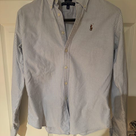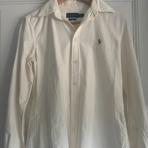 Ralph Lauren skjorte for dame i størrelse M. Skjorten er hvit og laget av bomull. Klassisk modell med krage, knappelukking foran og lange ermer. Diskré logo brodert på brystet. Passer til både hverdagsbruk og mer formelle anledninger.