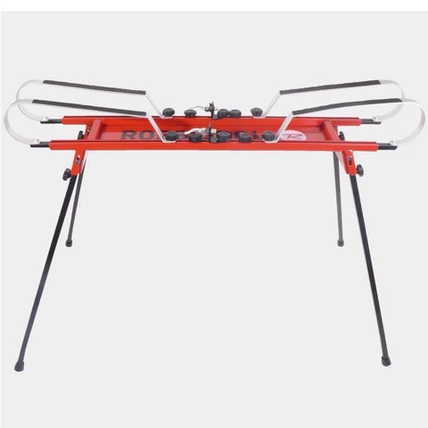 Swix smørebord for ski i rød farge. Bordet er sammenleggbart og konstruert for å gi stabil støtte ved prepping og smøring av ski. Egnet til bruk i garasje, bod eller andre arbeidsområder der man trenger et fast underlag til skivedlikehold.