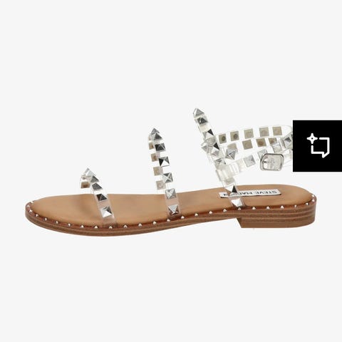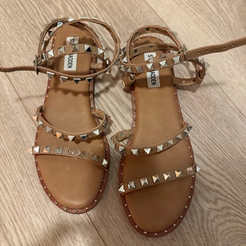 Steve Madden sandaler i størrelse 36. Normal i str som ny, hele og fine. Modellen har flate såler og transparente remmer dekorert med metalliske nagler. Sandalene har justerbar ankelrem med spenne. Passer som sommersandaler til hverdagsbruk eller til enklere penere antrekk.