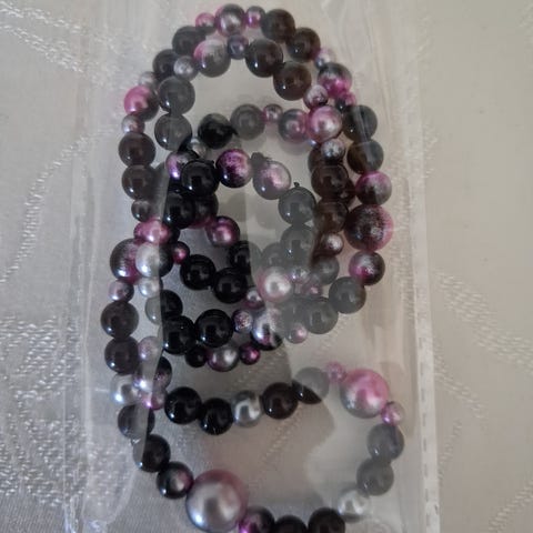 Perlearmbånd med små runde perler i rosa, blå og hvite toner, kombinert med gullfargede mellomledd. Ett av armbåndene har hvite bokstavperler med teksten «PINK». Armbåndene har metallfarget lås og er laget av plast- og metallperler. Passer som enkelt smykke til håndleddet.