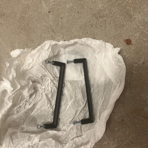 Messing håndtak til skap eller skuffer. Håndtakene har avlangt grep og festes med skruer gjennom dør eller skuffefront. Egnet til bruk på kjøkkeninnredning, garderobeskap, kommoder eller andre møbler der man ønsker et metallhåndtak i messingfarge.