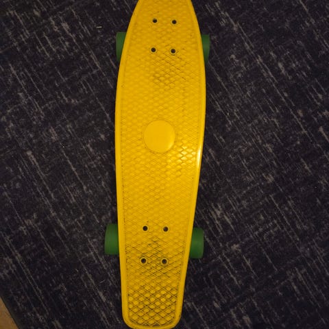 Penny Classic cruiserbrett i plast. Brettet har lilla deck med gule trucks og grønne hjul. Kompakt plastkonstruksjon som egner seg godt til cruising og kortere turer på jevnt underlag. Passer for både barn, ungdom og voksne som ønsker et lite og lett skateboard til hverdagsbruk.