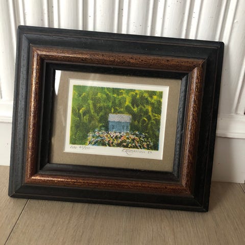Innrammet grafisk trykk med tittelen «Grundvik». Motivet viser et landskap med elv, steinmur, bygninger og skog i bakgrunnen, utført i sort-hvitt. Bildet er signert av kunstneren nede på arket. Trykket er montert med passepartout og rammet inn i en enkel ramme med glass. Egner seg som veggdekor i stue, gang eller kontor.