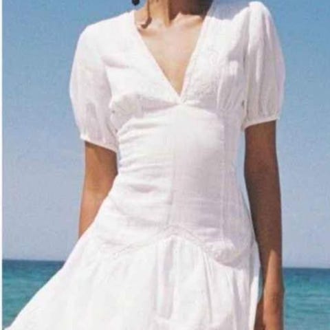 sommerkjole for dame i størrelse S. Kort, ermeløs kjole i hvit bomull med broderte detaljer. Dyp V-utringning foran og bak, med knyting under bysten. Glidelås i ryggen for lukking. Lett og luftig materiale som passer godt til varme dager og uformelle anledninger.