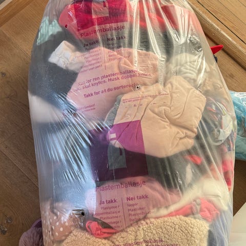 Barneklær passende ca str 6-8 år. Pakken inneholder et utvalg plagg som blant annet jakker, gensere, bukser, kjoler, topper, shortser, pysjamaser, strandklær, treningstøy, fleece, strømpebukser og sokker i ulike farger og mønstre. Klærne er beregnet på jenter rundt størrelse 116-128 og passer til hverdagsbruk og fritidsaktiviteter. Materialene varierer mellom de ulike plaggene, typisk bomulls- og blandingskvaliteter. Noen få klær er i ull, men det meste er bomull. noe syntetisk også. Klærne er fra merker som H&M, Kappahl, Bergans, M&S, Lil Atelier, Reflex, Name it, skogstad.