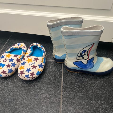 Regnstøvler merker 27, fleecestøvler merker 29, men tror de er lignede instørrelse.