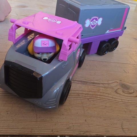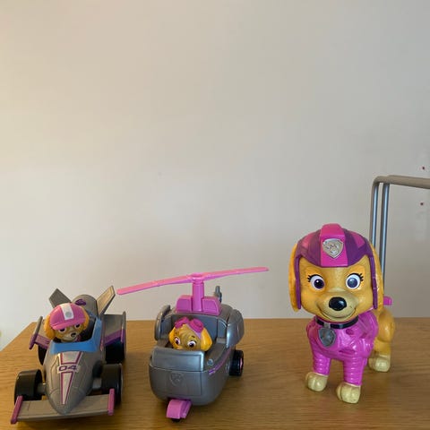 Paw Patrol Skye helikopter lekesett i plast. Settet består av et helikopter i grå og rosa farger samt en Skye-figur som kan plasseres i cockpiten. Helikopteret har roterende rotorblad og detaljer fra Paw Patrol-universet.