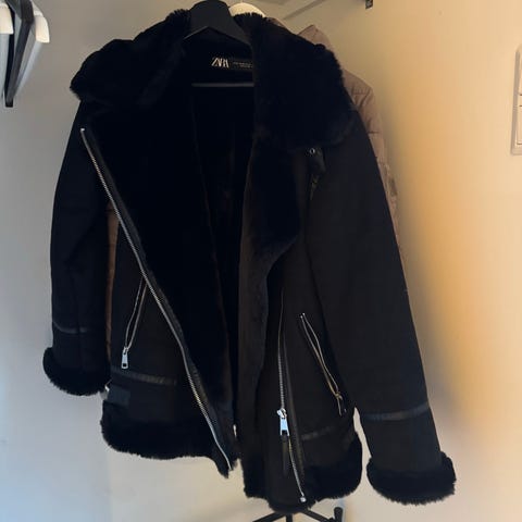 Zara vinterjakke for dame i størrelse XS. Jakken er svart og er foret med fuskepels. Den har også hette med fuskepels, glidelåslukking foran og flere lommer med glidelås og trykknapper. Innsnitt i livet for mer tilpasset passform.