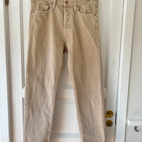 Levi's 505 herrebukse i beige bomull. Buksen har livvidde W36/ 34 i lengden Klassisk 5-lommers modell med glidelåsgylf og beltehemper. Materiale i bomull gir et mykt og behagelig stoff som egner seg til hverdagsbruk. Jeansen er veldig lite og pent brukt 36/34