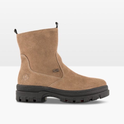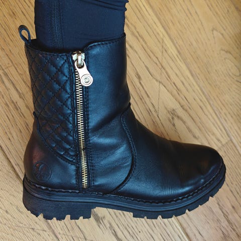 Rieker støvler i størrelse 40. Støvlene er i svart farge med kraftig yttersåle og elastiske partier i skaftet for enklere av- og påtaking. Overdelen er i glatt materiale med enkel, ren design. Sålen har grovt mønster som gir godt grep. Passer til hverdagsbruk i kjøligere vær.