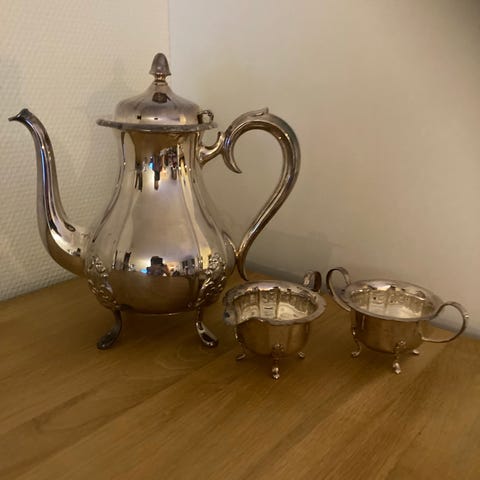Kaffekanne i sølvplett med dekorativt utformet håndtak, tut og lokk. Kannen står på fire utsmykkede føtter som gir god stabilitet. Lokket er hengslet og har et formet håndtak på toppen for enkel åpning. Innvendig har den en flekk etter bruk. Pen utvendig. Har klassiske ornamenterte detaljer som gir et tradisjonelt uttrykk. Passer til bruk ved servering ved bord eller som dekorativ gjenstand i interiøret.