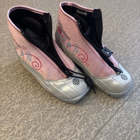 Alpina barne skisko i rosa og grå farge. Modellen har glidelåslukking foran og er polstret på innsiden for økt komfort og varme. Yttermaterialet er laget for å tåle snø og fukt, og sålen er tilpasset langrennsski for barn. Egnet til bruk på tur og lek i skiløypa.