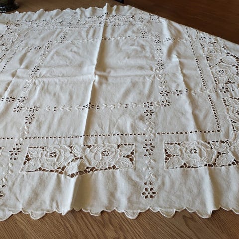 Selger et vakkert, håndheklet teppe i en svært allsidig størrelse. Dette er et detaljrikt og stødig håndarbeid som fungerer like godt som en elegant duk til middagsbordet som et dekorativt teppe til sengen eller sofaen.