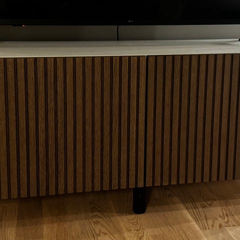 TV-benk fra IKEA, nypris er 3000kr. Lys eik og hvite fronter med soft close. Ingen bruksmerker som jeg kan se. Vi har hatt den veggmontert og i det siste midlertidig med 20cm høye bein for å ha plass med robotstøvsuger under, beina (8stk) kan følge med for 200kr (nypris 1000kr).