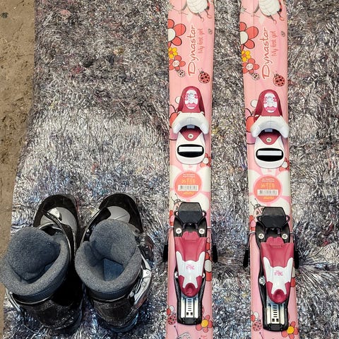 G3 POWAH (By Rossignol) alpinski med bindinger. Skiene har lengde 100 cm (markert «100» på skiene) og er beregnet for barn.