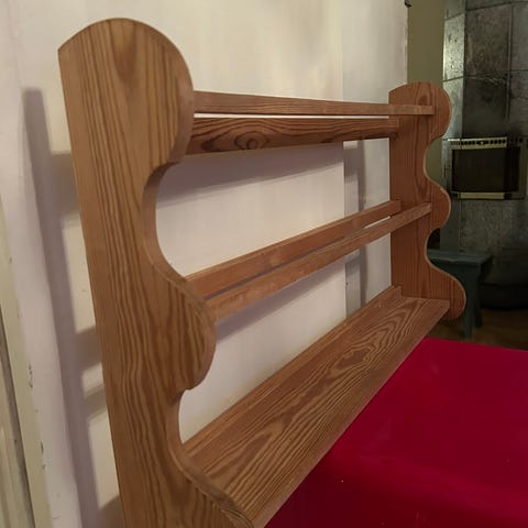 Søkeord: kjøkkenhylle hattehylle trehylle bokhylle hyller gran cottage core håndlaget utskjæringer vegghengt hyttemøbler hytte håndskåret