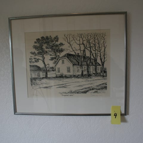 Innrammet grafisk trykk med motiv fra Elingaard. Bildet viser et landskap med trær, bygninger og vann i svart-hvitt. Trykket er signert av kunstneren og innrammet med passepartout og enkel ramme. Egnet som veggdekor i stue, gang eller kontor.