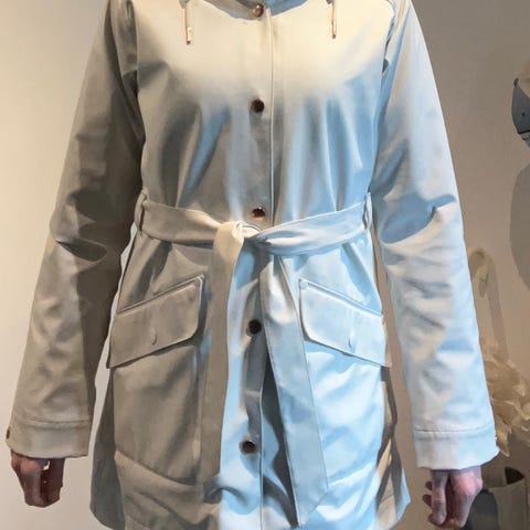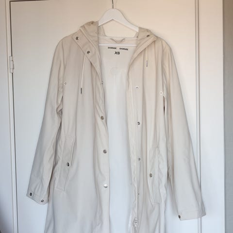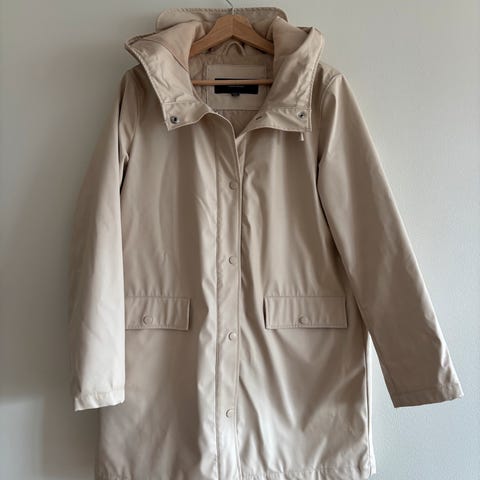 Samsøe Samsøe regnjakke for dame i størrelse S. Jakken er beige og laget i polyester. Den har hette med snøring, knepping i front og skråstilte lommer i sidene. Lengden går ned over hoftene.