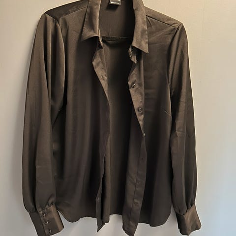 Gina Tricot skjorte for dame i størrelse L. Skjorten er svart og har lange ermer. Knapping foran og krage. Passer til hverdagsbruk eller mer pyntede anledninger, og kan brukes både åpen over topp eller lukket som vanlig skjorte.
