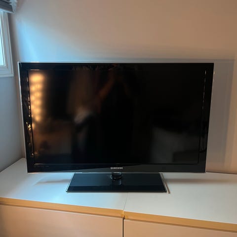 Samsung TV i svart, 32 tommer. Flatskjerm med rektangulær ramme og bordstativ. Passer til bruk i stue, soverom eller som ekstra TV. Tilkoblingsmuligheter med HDMI etc, kan brukes med både Chromecast og AppleTV. Ingen bruksmerker, god som ny!