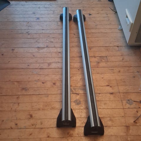 Thule Wingbar Edge i sort, har stått på Volvo XC60 2017-modell. Noen merker i gummilist hvor et skistativ har stått, samt noen merker på to av plastdekslene.