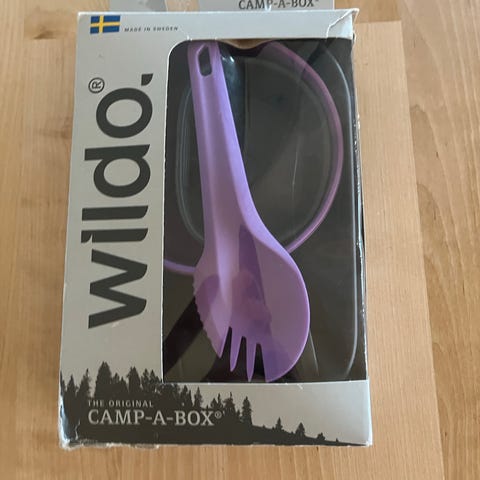 Wildo matboks tursett i plast består av flere deler i rød og svart farge. Settet inneholder en rektangulær boks med lokk, en innsats/skål, en mindre kopp eller bolle, en liten beholder samt en kombinert gaffel/skje (spork). Delene kan pakkes sammen i boksen for enkel oppbevaring og transport. Egner seg til mat og drikke på tur, camping eller lignende bruk.