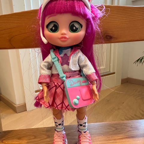 Dukken er lekt med men er i god stand. Har et par flekker i ansiktet, og jakken har rester etter glitter.