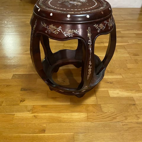 Sjeldent par av autentiske kinesiske trommebenker i solidt tre, dekket med dyp rød lakk og vakker gullmaleri av blomster. Noen detaljer har perlemor-inlay som gir et skjønt lys.