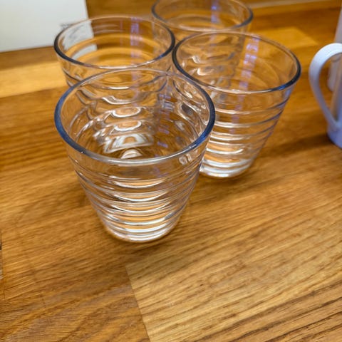 Det er 4 stk av det meste. Det mangler 1 stk lite glass, og 1 gaffel.