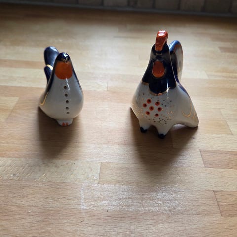 Selger en salt og pepper bøsse fra porsgrund i serien "Tuppe" Design Anne M Ødegård.