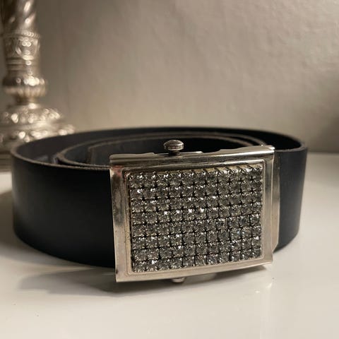 Nydelig belte i skinn. Beltespennen belagt med strassteiner.