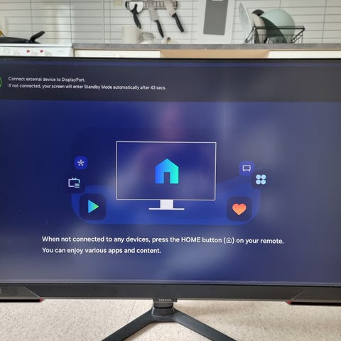 Skjermen har et moderne, slankt design med smal ramme og V-formet bordstativ. Baksiden har detaljer i en kontrastfarge. Skjermen kan brukes som dataskjerm eller TV-skjerm ved tilkobling av egnet utstyr og kilder.