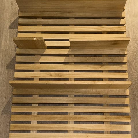 Smal, frittstående bokhylle i mørkbeiset tre eller finér til salgs. 5 hyller hører til. Klassisk skandinavisk design fra ca. 1970–80-tallet. Alder ukjent. Solid og stabil konstruksjon med justerbar hylle. Passer godt som bokhylle, arkivhylle eller til dekor og oppbevaring.
