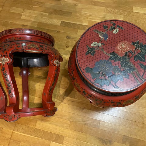 Vakker, håndlaget kinesisk trommekrakk i solid hardtre med dekorativ perlemorinnlegg. Klassisk trommeform med utskårne sider. Meget pen stand.
