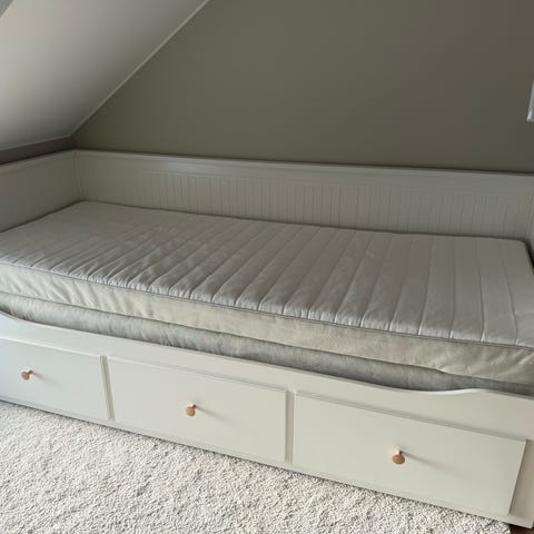 Kan dras ut til dobbeltseng. Fin oppbevaring under i skuffene. Følger med madrasser. Lånt bilde fra Ikea,. Str 80x200 cm
