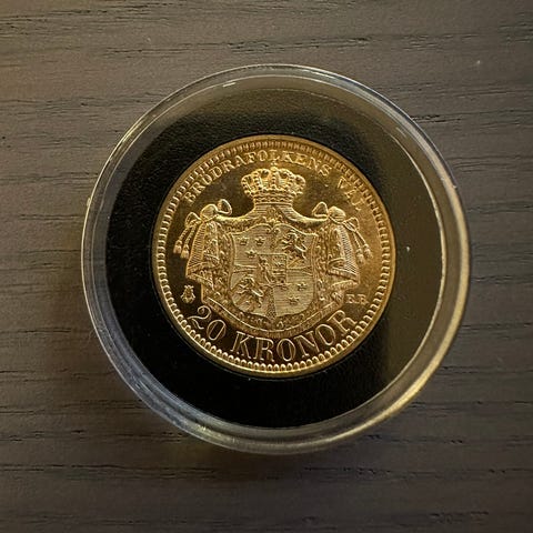 Gullmynten veier 6,45 gram 900 gull (= 5,8 gram 999 gull).