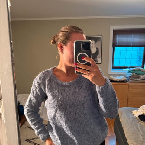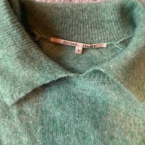 Second Female genser i ull for dame i størrelse S. Genseren er flerfarget med brede horisontale striper.