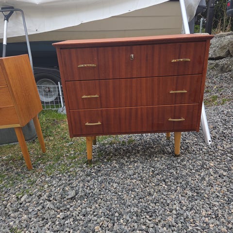 Flott 5 skuffers teak skjenk / kommode med flotte stilrene messing håndtak fra Ørstad Bruk as på Ørstadvik. Kommoden har i tillegg til de 5 solide skuffene en dør på 35 cm og her er det 3 stk dokument skuffer. Alt i fint stand kan også brukes som entremøbel eller tv benk. Se bilder og bare be om flere hvis behov.