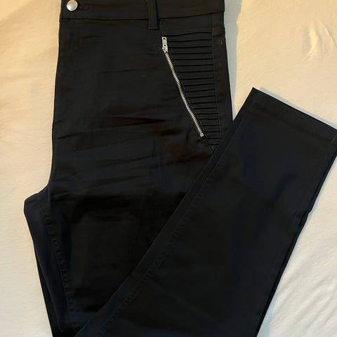 H&M bukser for dame i størrelse 42. Buksen er svart og laget av bomull. Modellen har glidelåslommer foran, baklommer og glidelås nederst på bena. Egnet til hverdagsbruk og annen fritidsbruk.