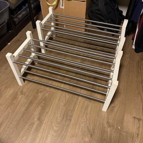 Selger to av tre skohyller. Ny koster én skohylle kr 450. Selger én hylle for kr 225, to hyller for kr 400. Pent brukt og i god stand, men noen bruksmerker.