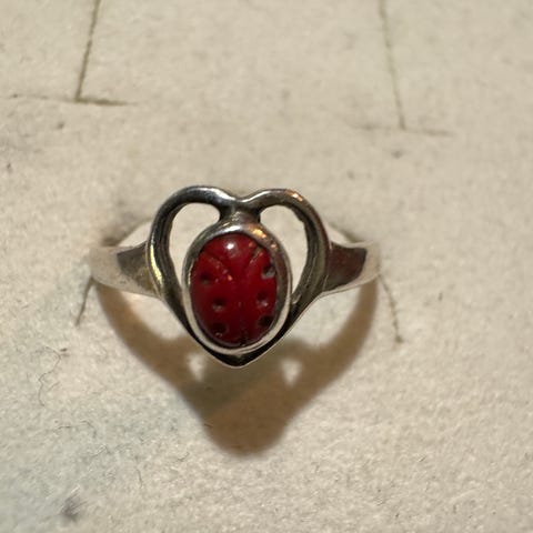Ring, rød sten, glass, sølv farget, damering, vintage, antikk?, gammel, sisselering, rosemønster, smykke,