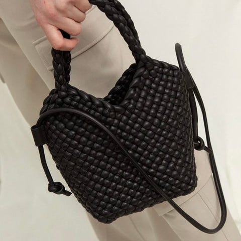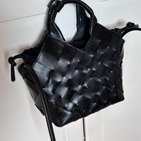 Cala Jade Ena lærveske for dame i svart farge. Vesken har et flettet rute-mønster i glatt skinn og to bærehåndtak. Den rektangulære fasongen gjør at den kan brukes både til hverdags og til mer formelle anledninger. Laget i lær med ensfarget overflate. Superfin jobbveske. Brukt kun ved en anledning. Nypris var kr 7.000. Dustbag følger med. bredde 29cm, høyde 35cm, dybde 20cm. Skulderskade 50cm. Håndtaksfall 16cm. Kan sendes eller overleveres i Vika Oslo.