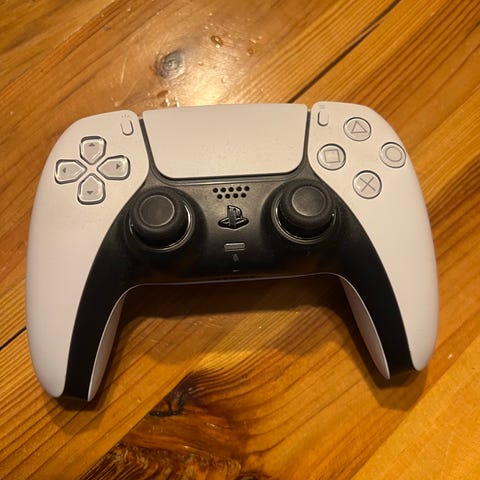 Sony DualSense kontroller til PlayStation 5 i hvit. Noe knekt plast ved venstre thumbstick, men lite synlig og fungerer som den skal.