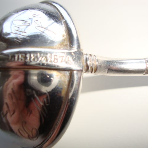 Dekorativ skje i metall med relieffmotiv på skaftet. Skaftet har utskårne detaljer og figurmotiver på begge sider.