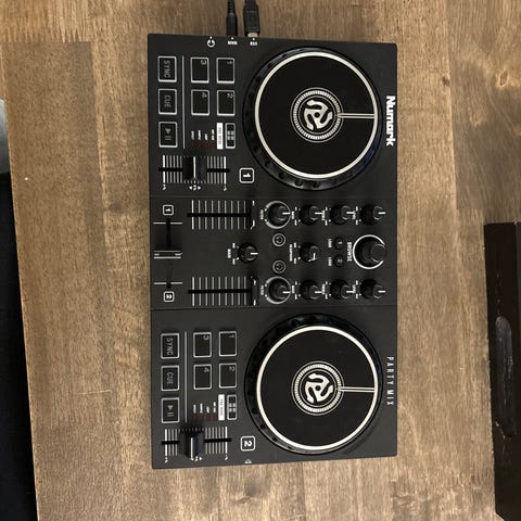 DJ-kontroller i svart med to joghjul, mikserseksjon og flere pads og kontrollknapper. Enheten har fader, EQ- og effektkontroller, samt dedikerte knapper for avspilling og cue. Passer til bruk sammen med DJ-programvare på PC eller Mac, og er egnet for miksing og grunnleggende DJ-bruk hjemme eller på mindre arrangementer.