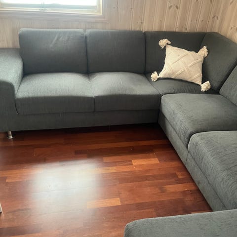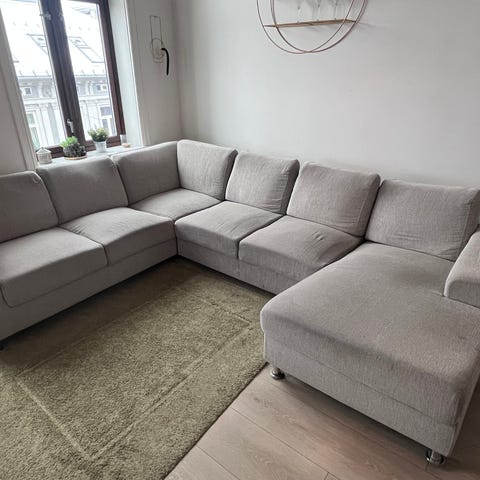 Sofaen er veldig komfortabel og uten synlig flekker, har noen slitasje under putene samt noe solbleking.