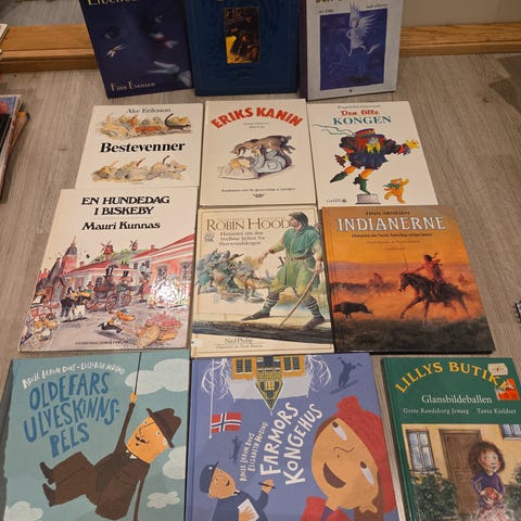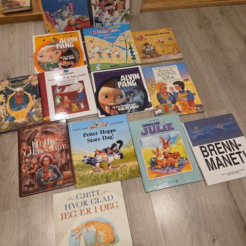Pakke med diverse barnebøker og bildebøker på norsk. Bøkene har ulike temaer og illustrasjoner, og egner seg til høytlesning og egenlesning for barn i ulike aldre. Flere kjente titler og forfattere er representert. Selges samlet som én pakke.