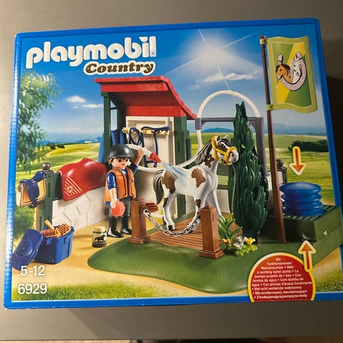 Playmobil Country 6929 leke-sett hestestell. Settet viser en vaske- og stellestasjon for hest, med baseplate, gjerder, vaskeplass med rist, flagg og tilbehør. Det følger med hest med dekken, Playmobil-figur, bøtte, børster og annet småtilbehør til hestestell.